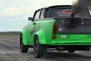 D’après la description faite dans la vidéo ci-dessous, ce dragster Trabant immatriculé en Pologne a été vu au « Turboscheune Test & Tune » de Finsterwalde en Allemagne où il a pu affronter une VW Golf VR6 Turbo sur le quart de mile.